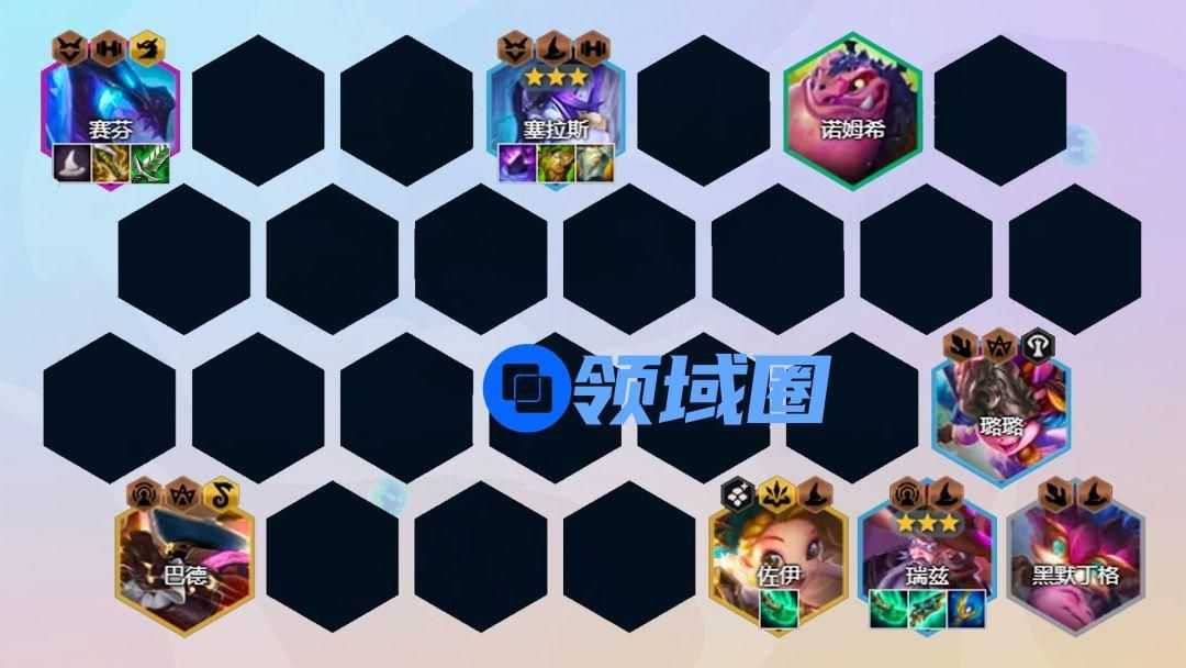阵容组成:黑默丁格、瑞兹、佐伊、璐璐、塞拉斯、赛芬(法转纹章)、巴德