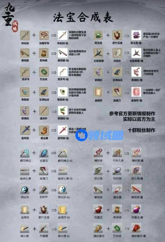 在九重试炼中,诛仙剑是一个十分强大的法宝,但是许多人却又根本就不知道该如何去正确的合成诛仙剑,看到别人手中的诛仙剑,总是垂涎欲滴,那么这个时候你也不用太过担心,因为小编接下来将会为你详细的介绍诛仙剑的合成表,让你也能够顺利的得到诛仙剑!