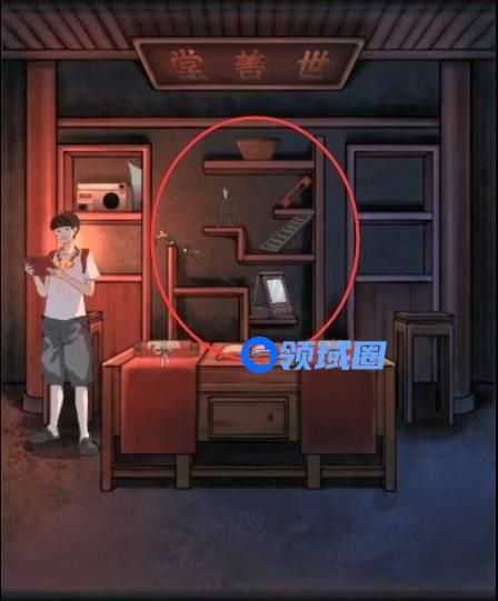 用钥匙打开庭院左边的门找到【电池】【镜子】【嫁衣】,把电池装到收音机上调到35.4得到【红色指针】,红色指针装到左边房间衣柜的盒子里按照【蓝色两点黄色六点红色九点】打开盒子得到【一半玉佩】。