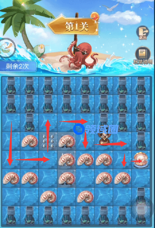 1、开局的时候先把面前的海螺推成下图的样子,然后往下走从陷阱下方走到螃蟹那边。