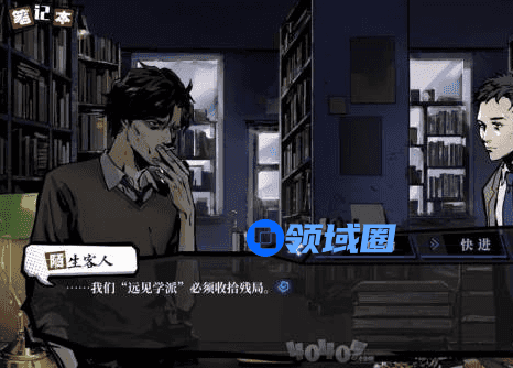在小猫和小侦探回来以后,小猫已经取得了黄老太的全家福。这个时候一定要去书架上看这本书。在阅读过这本书后你手中的线索会更新,然后你才能应对接下来的【远见学派的目的】的论证。