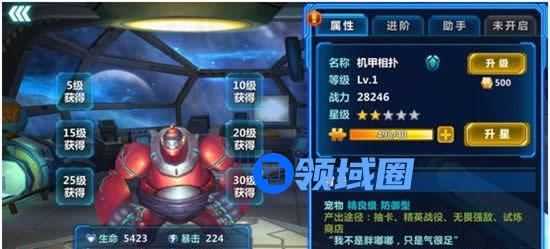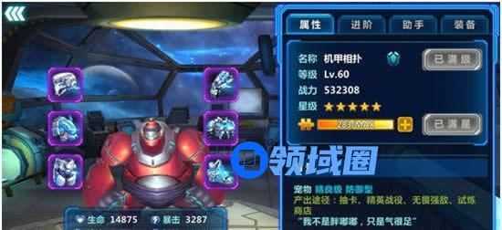 大家从下图中机甲相扑宠物界面左下方属性栏里可以看到,宠物有7种基础属性,分别是生命、攻击、防御、暴击、韧性、命中、和闪避。此外宠物还有等 级,宠物等级不能超过主人当前的等级,目前版本最高60级。跟等级直接挂钩的是宠物自身的6件装备,分别在宠物升级到5的整数倍等级时解锁并自动获取。同 时玩家可以在最右边“装备”选项(宠物升级到5级时解锁)里对已经解锁的装备用金钱升级,每个10的整数倍等级都是一次进阶,需要额外消耗关卡掉落的相关 资源而不仅仅是金币。宠物等级和装备等级的提升及装备的进阶都会直接反馈到宠物基础属性和战斗力的数值成长上。