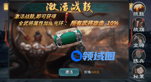 激活战鼓可以为全武将提供百分比属性加成效果。
