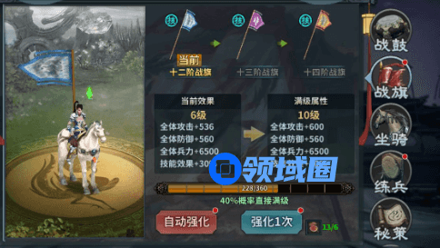 对战旗可以进行强化,强化所需“灵漆”,强化有几率直接满级,获得大量全属性提升。