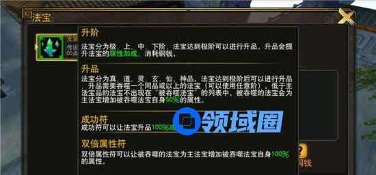 3、法宝的品质提升会有一定几率失败,但成功后会为角色带来可观的属性提升,修仙之途怎么能缺少法宝的陪伴。