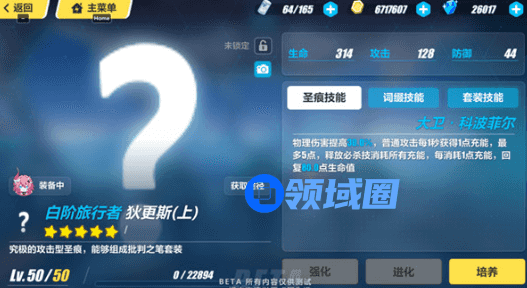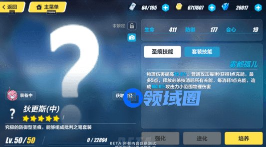 物理攻击提高30%,普通攻击每1秒获得1点充能,最多5点。释放必杀技消耗所有充能,每消耗1点充能,回复80点生命值。