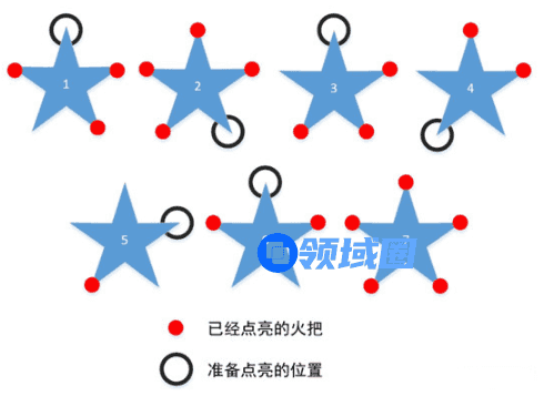 先说原理:点亮某个火炬后,会同时翻转对面的两个火炬的状态(亮/熄)