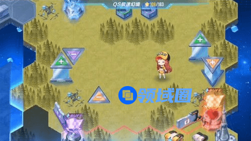 第七步:下去之后玩家可以看到2座能量炮塔和黄、绿、紫三个控制按钮。我们先将紫色的立柱升起来然后使用左侧能量炮打碎晶体,这样就可以解锁第二关的快捷入口。