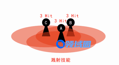 第三,溅射机制本身的作用过程如下:在一次技能范围判断中,范围内的每个敌人都会对范围内所有敌人造成一次溅射伤害。具体可以参考下图。由于溅射技能同时命中ABC,ABC同时对周围敌人产生一次伤害判定,最终每个角色都受到三次伤害。