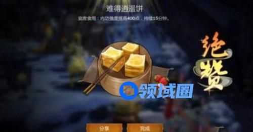 属性效果:使用该食物需要消耗25点饱食度,使用后玩家的内功值将提升400点,每使用一个难得逍遥饼,就可以持续15分钟,可以持续适应,时间能够进行叠加,效果无法叠加,最多只能提升400点内功。