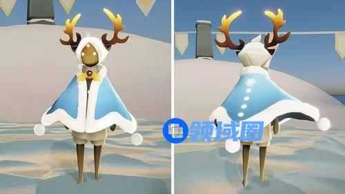 2、雪花斗篷外观是天蓝色,底部搭配白色的绒毛,斗篷的底部带有白色的小球挂坠。