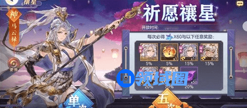 在祈愿禳星活动中,玩家可以选定马云禄或花�N进行招募,选择的武将会和其他材料一并进行抽取。祈愿禳星活动中,除可招募马云禄或花�N外,还可获得马云禄碎片、花�N碎片、随机神将将魂、兵魂物品,且每次招募必当获得祈愿星币*60,祈愿星币可用于在活动宝库中兑换主城皮肤【丹枫迎秋】、马云禄碎片、花�N碎片等奖励。