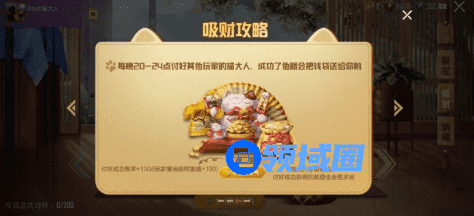 那么下面简单来讲讲进阶的玩法,首先是“吸财”页面,你可以在每天的20到24点,消耗1个【猫元宝】来“讨好”其他玩家的喵大人,有概率获得它所有财富值对应的钱袋。