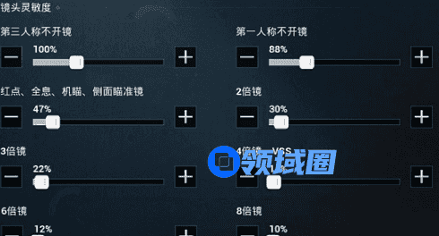 3、镜头灵敏度:第三人称不开镜100%;第一人称不开镜88%;红点、全息、机瞄、侧面瞄准镜47%;2倍镜30%;3倍镜22%;4倍镜、VSS14%;6倍镜12%;8倍镜10%。