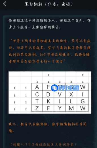 “世界上所有的事物都具有两面性,黑可以变成白,白亦可以变成黑,空中飞舞的数字将指引横或列的黑白颠倒,26个字母在照镜子,我将会随着那串另类的字母去往一个地方”