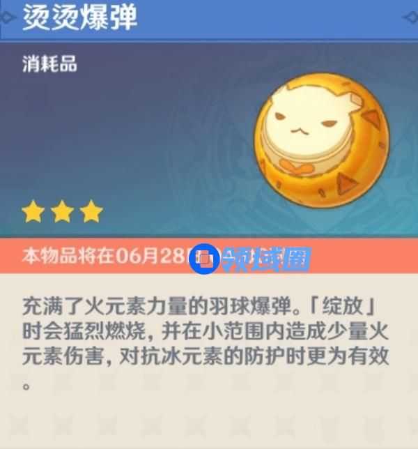 烫烫爆弹俗称开盾神器,用来丢给大冰史莱姆和冰盾丘丘人,这破盾速度压根都不需要相对应的元素了啊。