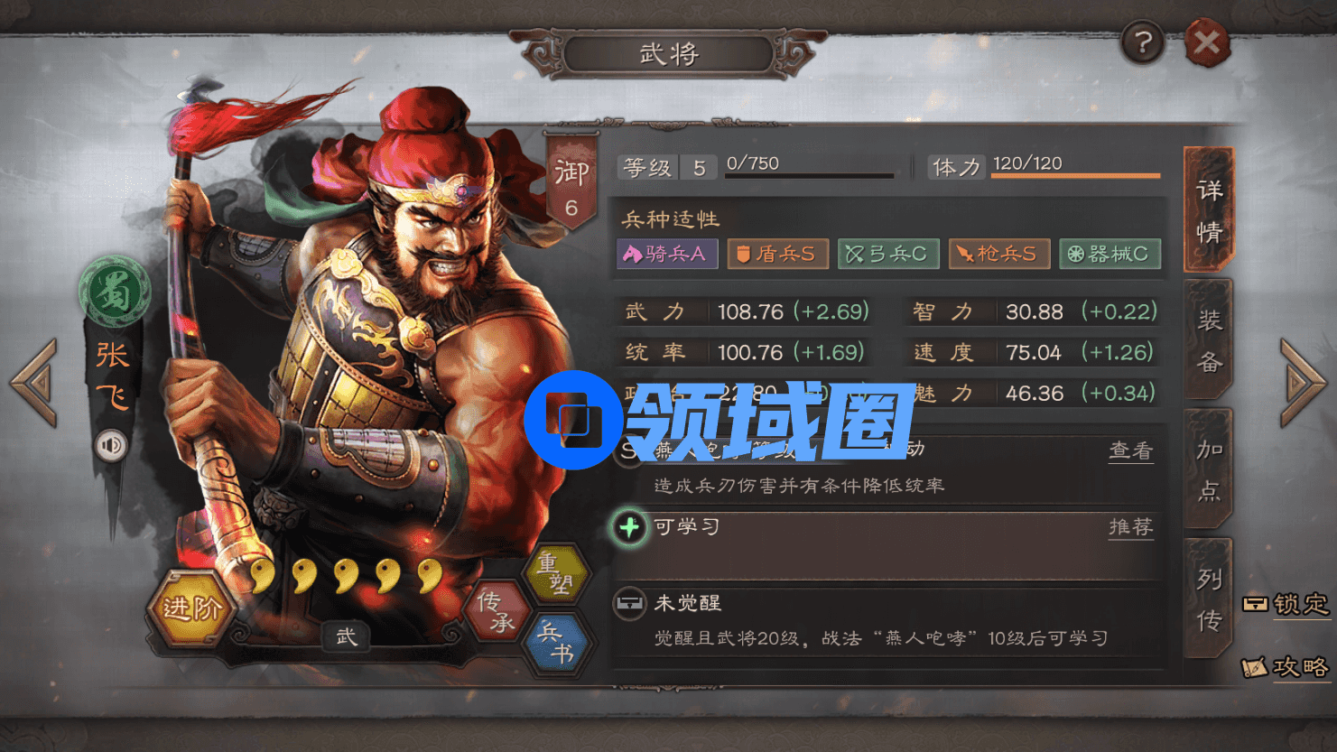 在兵种适性方面,张飞各个兵种的适应度分别是:骑兵(A)、盾兵(S)、弓兵(C)、枪兵(S)、器械(C)。 属性方面张飞也很优秀,武力、统率、速度都是亮点,智力、政治和魅力很低,但这些问题不大。