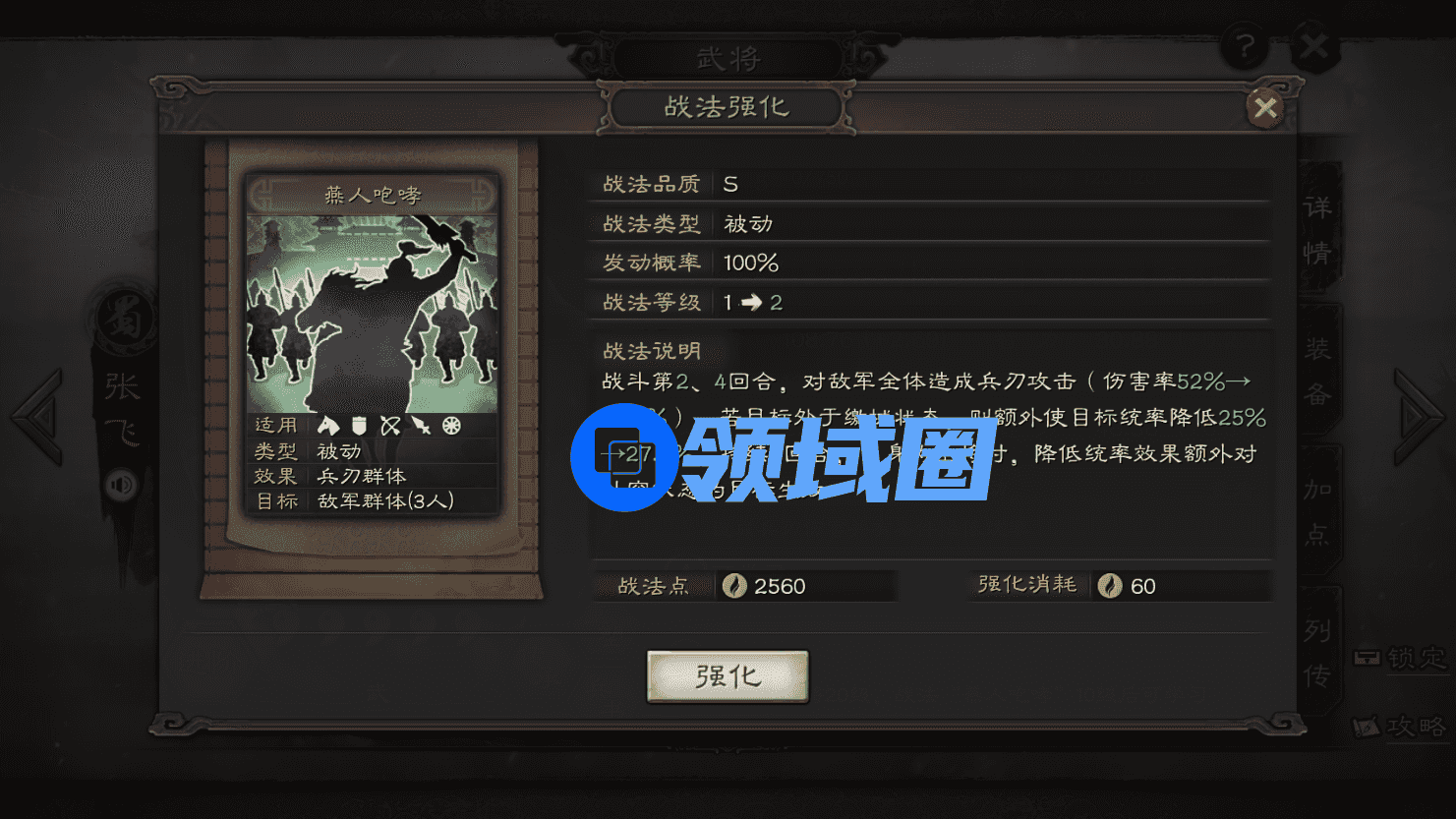 战法讲解:前文说的正是「燕人咆哮」这一战法,具有稳定的全体伤害能力,在这种SLG这种概率游戏中,能够稳定造成伤害的技能一直都非常吃香,因此,自带「燕人咆哮」这一战法的张飞自然也不例外。除了能够打出稳定的伤害,「燕人咆哮」还有个特点,就是能够和缴械以及技穷这2种状态产生联动状态,和「盛气凌敌」有着联动效果,所以各位会看见凡是携带了张飞的队伍都携带了「盛气凌敌」这一战法。至于和技穷状态产生联动效果则需要张飞身处主将位时才能生效,如果你是搭配许褚玩爆头队,那么主将位放张飞是没什么问题的,但是如果组蜀枪或是桃园,将张飞放置在主将位明显就不合适了。
