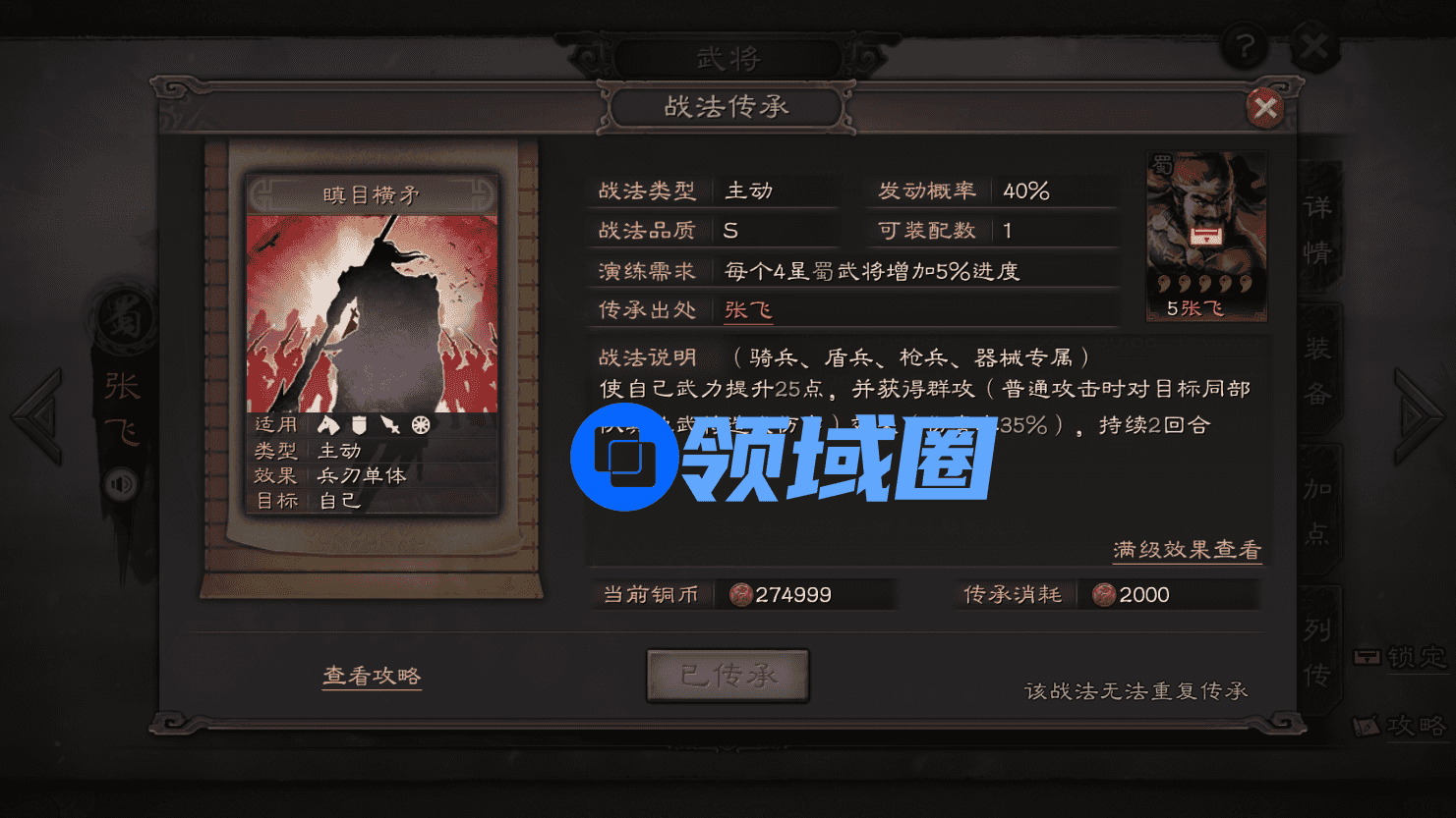 战法描述:使自己武力提升25(50)点,并获得群攻(普通攻击时对目标同部队其他武将造成伤害)效果(伤害率35%-70%),持续2回合。