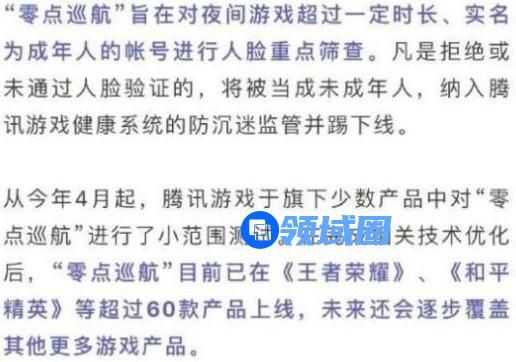 简单来说,腾讯新上线的零点巡航功能是为了限制未成年人冒用成年人身份在夜间偷玩游戏的问题,防止未成年人过度沉迷游戏从而影响休息和学业问题。零点巡航旨在对夜间游戏超过一定时长、实名为成年人的帐号进行人脸重点筛查。如果没有通过验证或者拒绝验证的话就会被强制下线的。目前不止王者荣耀、和平精英被限制,此外还有近60款腾讯游戏已经正式上线了零点巡航功能。