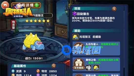 托塔斯王,6星物攻型武将,技能回旋撞击(优先攻击敌方中军,伤害为普通伤害的200%,增加自己500%防御1回合)。
