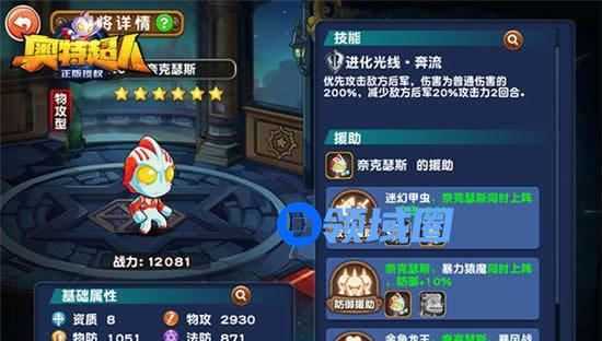 奈克瑟斯,6星物攻型武将,技能进化光线.奔流(优先攻击敌方后军,伤害为普通伤害的200%,减少敌方后军20%攻击力2回合)。
