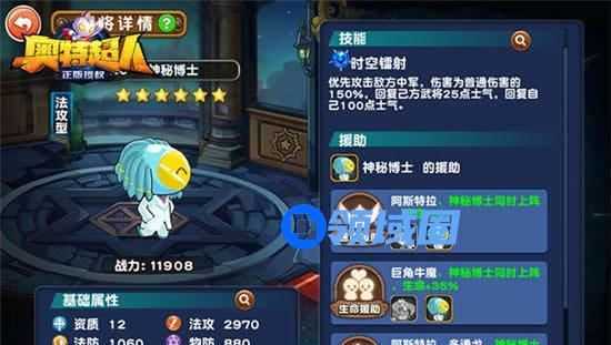 神秘博士,6星法攻型武将,技能时空镭射(优先攻击敌方中军,伤害为普通伤害的150%,回复己方武将25点士气,回复自己100点士气)。