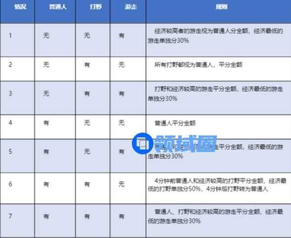 我们根据线上经济分配时参与玩家的类型构成分为以下7类情况,每行代表一种分类情况(比如第6种情况表示线上经济分配时只有普通人和打野两种类型的玩家),并分别给出具体的分配规则: