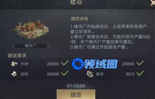 同时,我们要注意到,建造一个1级铸币厂,需要20000石料,20000木材,20000铁锭,以及3个政令。时间需求为1小时10分钟,5个铸币厂则是需要10万的石料,木材,铁锭,以及15个政令,对于资源和政令的需求量还是相当大的。尤其是政令,太早全部开铸币厂会影响到当天的开荒发展,毕竟一天的自然产生政令也才24个政令。
