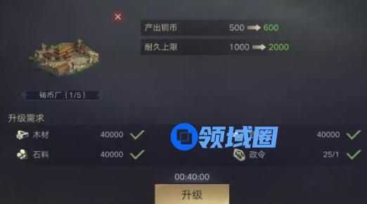 升级2级铸币厂,铜币产出变为600/每小时,耐久值变为2000,比上一级铸币厂稍微肉一点了。但资源量的需求就变成4万石料,木材,铁锭,以及一个政令。