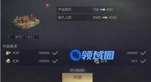升级3级铸币厂,铜币产出变为700/每小时,耐久值变为3000。资源需求量与上一级相比,直接再次翻倍,就变成8万石料,木材,铁锭,以及一个政令。