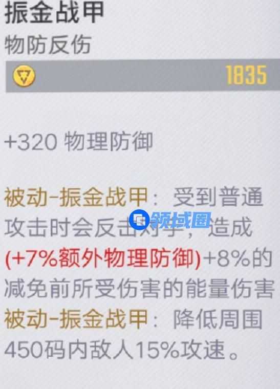 6.第六件镇金反甲。首先镇金反甲的被动可以把自己额外的物抗加上8%减免前受到的伤害,意思就是把320点之前的伤害还一点再把自己的物抗也换一点能量伤害,如果像我这种出装只要对面不带穿透可以说那些刮痧的物理型英雄打的不疼自己反回去的也不算太疼,但是还要把自身的物抗分给人家一点点,另外镇金反甲的伤害是没有320(包括被动加的减免)点的,在我们后期抗性这么高的情况下如果对面不出悬浮斗篷、妖精面具、死神幻影这种装备基本上都是so easy,当然如果出穿透就是另一种结局了。