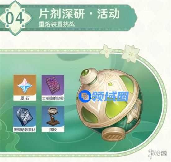活动期间,协助须弥的哈贾娜德进行研究,借助「重熔效应」进行战斗,完成相应试验和任务即可获取摆设「清馨良药的悬釜」、原石、天赋培养素材等奖励。