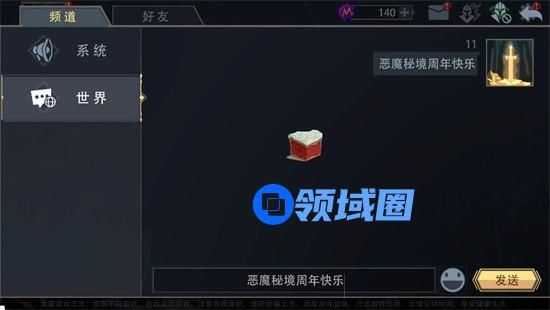 在【世界聊天】界面输入恶魔秘境周年快乐后,界面正中间会出现蛋糕块