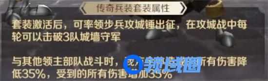 在攻城战中,每轮可以击破3队城墙守军。与其他领主部队战斗时,我方全体造成的所有伤害降低35%,受到的所有伤害增加35%。