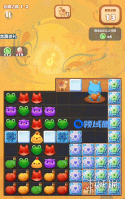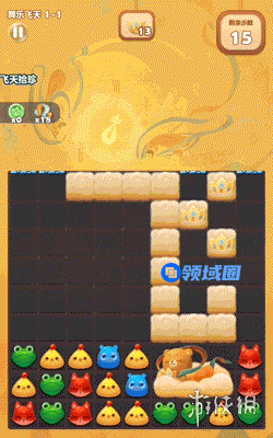 舞乐飞天关卡需消除莲花云、收集莲花,通过旁消2次栗熊可激活释放技能,随机将棋盘上的小动物替换为特效,助力完成关卡目标,莲花收集完毕视为挑战成功!
