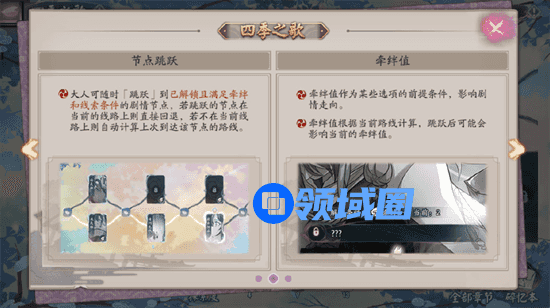 大人可随时「 跳跃」到已解锁且满足牵绊和线索条件的剧情节点,若跳跃的节点在当前的线路上则直接回退,若不在当前线路上则自动计算上次到达该节点的路线。