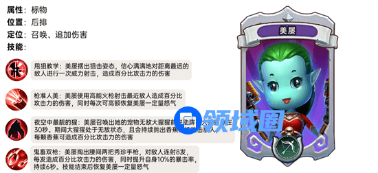 技能效果:美屡召唤出宠物大猩猩,大猩猩存在30秒,期间大猩猩处于无敌状态,且会持续抛出香蕉随机攻击敌人,每颗香蕉可造成百分比的攻击力的伤害。