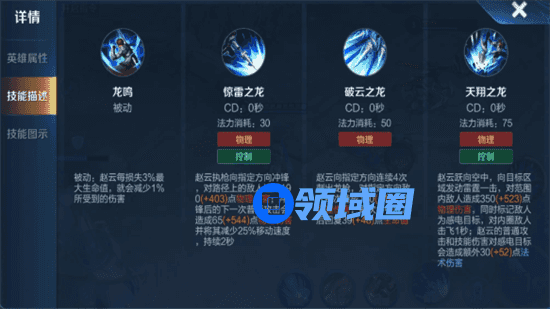 一技能:赵云的一技能是一小段位一技能,对指定方向发起冲锋,对路径上的敌人造成一定的物理伤害,而且可以强化下一次普通攻击的伤害。