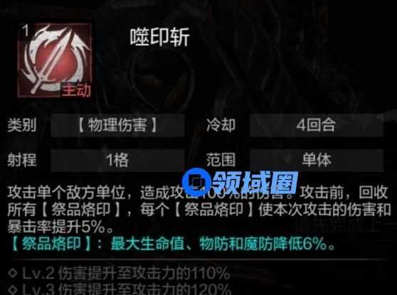 回合开始时,夺取自身周围1格内所有单位6%的生命值,并对其施加【祭品烙印】。场上每存在1个【祭品烙印】,自身全属性提升6%,持续1回合。触发间隔1回合。