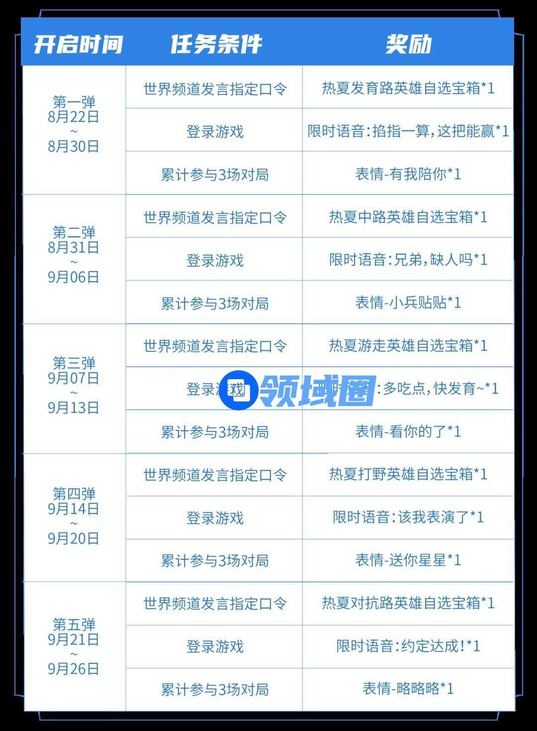 活动期间只需完成指定发言及登录、对局任务,一共可以领取5个英雄自选宝箱、5个表情、5句趣味语音!