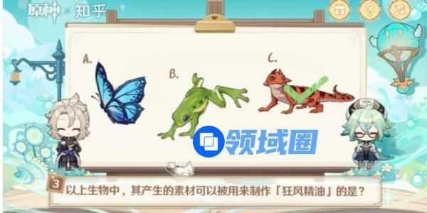 3、以上生物中,其产生的素材可以被用来制作「狂风精油」的是?【C】