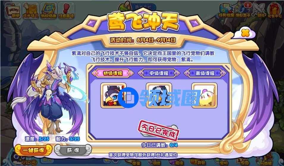 当速度和耐力均达到25点,就可以领取:紫鸢。