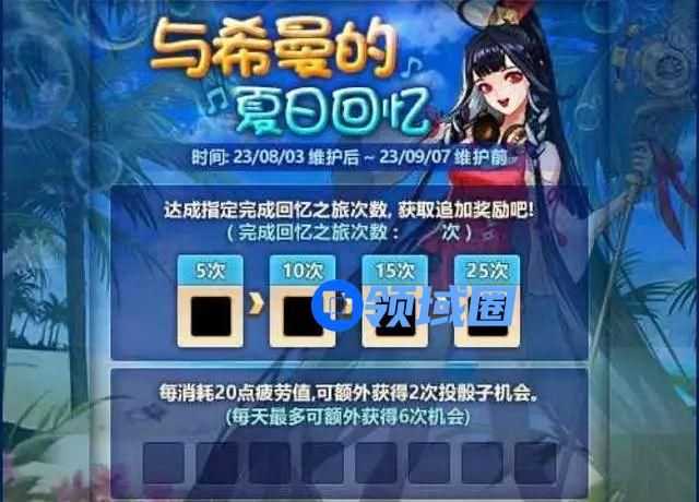 8月3日—9月7日,达成指定完成回忆之旅次数,获取追加奖励,每消耗20点疲劳值,可额外获得2次掷骰子的机会,每天额外可获得6次机会。