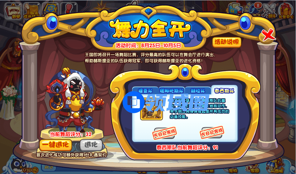 四支队伍一同学习挑战下来可以拿到32分;既然说到舞蹈评分,那么我们最终目的就是需要赫斯提亚在四支队伍中夺得头筹,拿下舞蹈评分之最,就能开启:赫斯提亚进化资格啦!