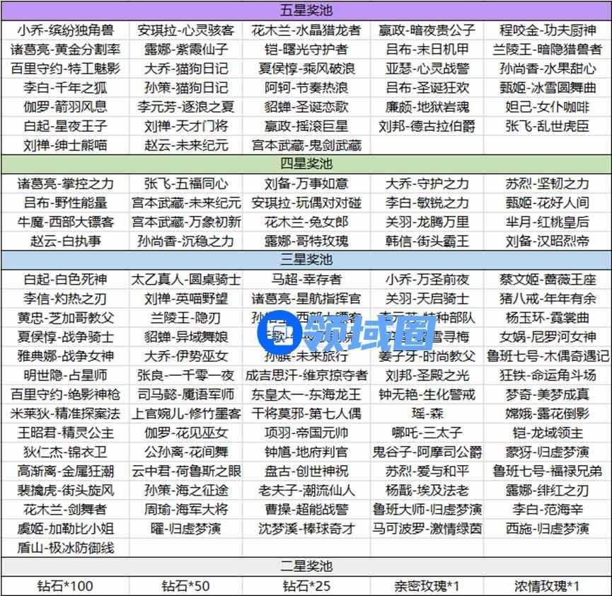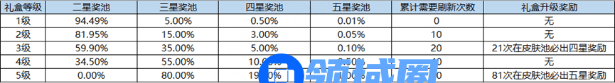 皮肤池保底奖励:当刷新次数达到20次时,下次刷新必出四星奖池及以上奖励;当刷新次数达到80次时,下次刷新必出五星奖池奖励(刷新时不会刷新到已经拥有的皮肤)。