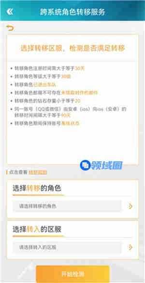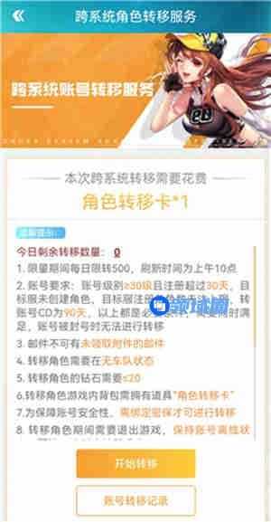 4、进入跨系统角色转移服务界面,点击开始转移即可,填上自己要转移的角色和区服。