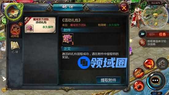 至邮箱内查收礼包,提取附件至个人背包内,即可成功兑换游戏礼包。