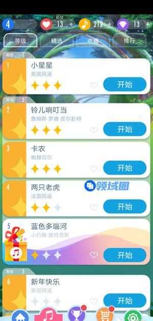 钢琴块的玩得高分的表现体现在获得的星星上,每个关卡都设置了三个星星,也就是说,只有从头到尾没有出现失误才能获得了这三个星星,那么问题就来了,不出现任何失误是很困难的,所以钢琴块2的设定是只要星星达到一定的数量就可以解锁新的音乐。