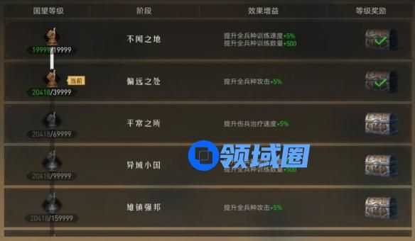 建立帝国后,将会解锁国望功能,帝国的国望级别提升,将会获得大量资源奖励以及各方面的属性增益效果。